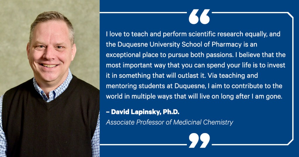 “I believe that the most important way that you can spend your life is to invest it in something that will outlast it,” Dave said. “Via teaching and mentoring students within the Duquesne University School of Pharmacy, I aim to contribute to the world in multiple ways that will live on long after I am gone.”