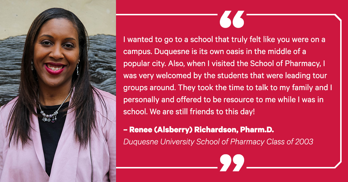 For Duquesne University alumna Renee Richardson, Pharm.D. (P’03), the journey to her fulfilling career in pharmacy was guided by a deep-rooted desire to help people and make a positive impact on her community. Drawing strength from her interactions with others, Richardson’s passion for health care and community service has led her to excel in her field and carve out her own unique career path as a pharmacist.