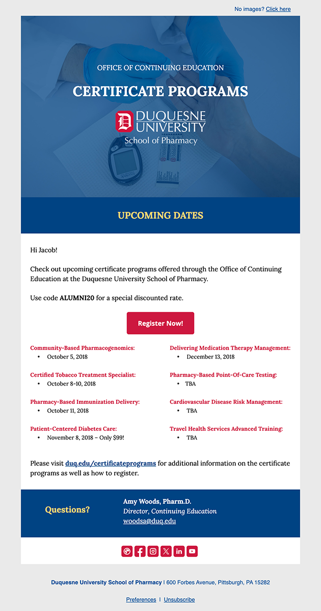 I utilized several different email lists, including School of Pharmacy alumni, School of Pharmacy preceptors and a list of opted-in pharmacists interested in CE programs offered through the Duquesne University School of Pharmacy and social media posts to promote the Continuing Education Winterfest, posting several times on Facebook, Twitter and Instagram encouraging pharmacists to sign up.