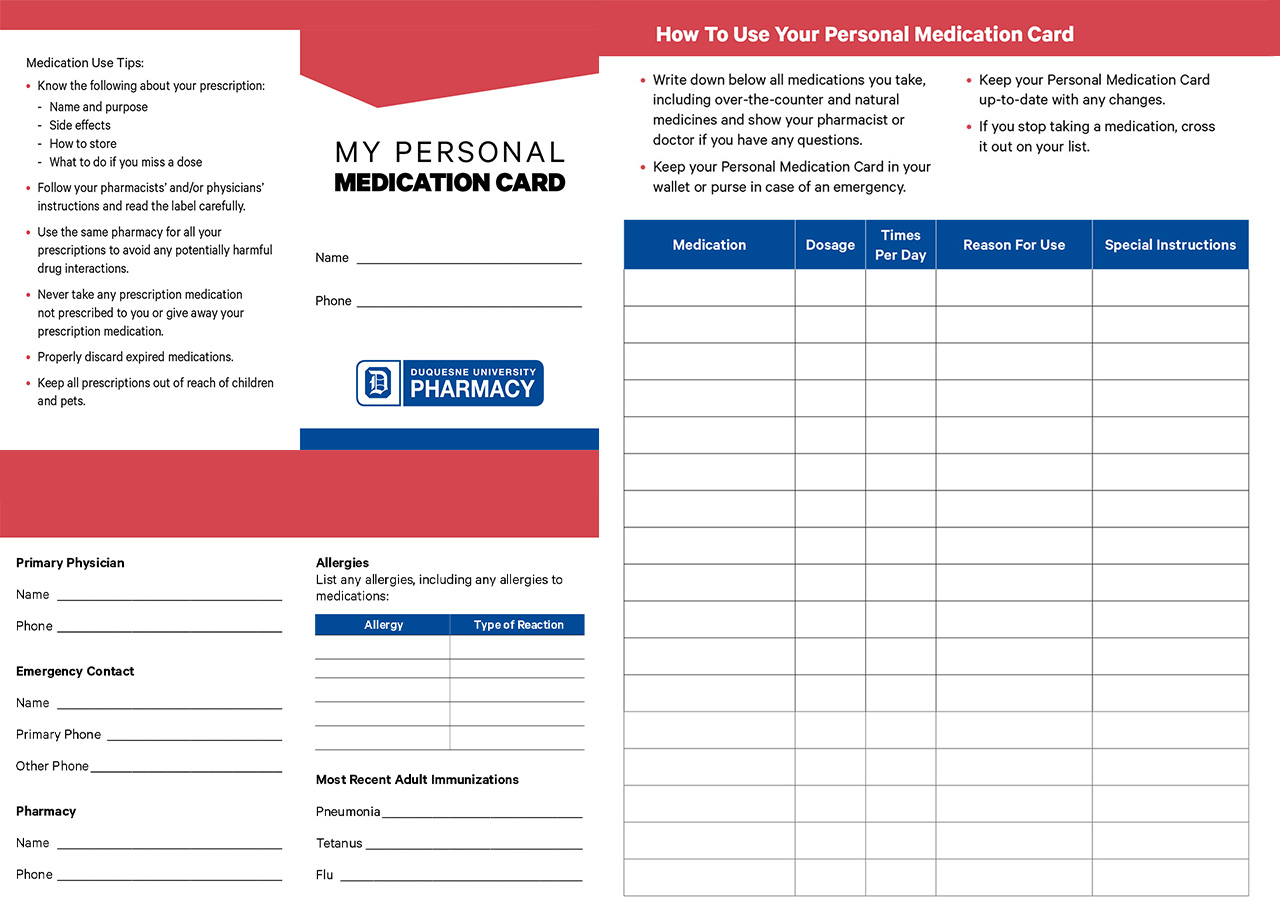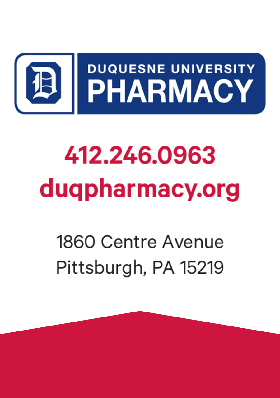 As a fully operational pharmacy, the Duquesne University Pharmacy welcomed customers in the Hill District and uptown Pittsburgh, offering free or significantly discounted prescription prices, vaccinations, health screenings and other services. I helped create several promotional and marketing materials for the Duquesne University Pharmacy including magnets, a card to track medications, postcards, signage and more.
