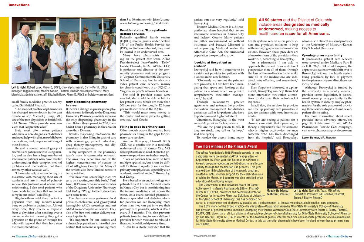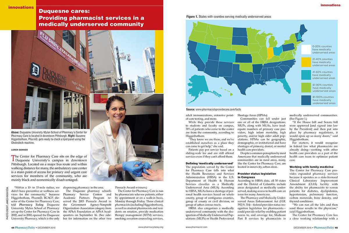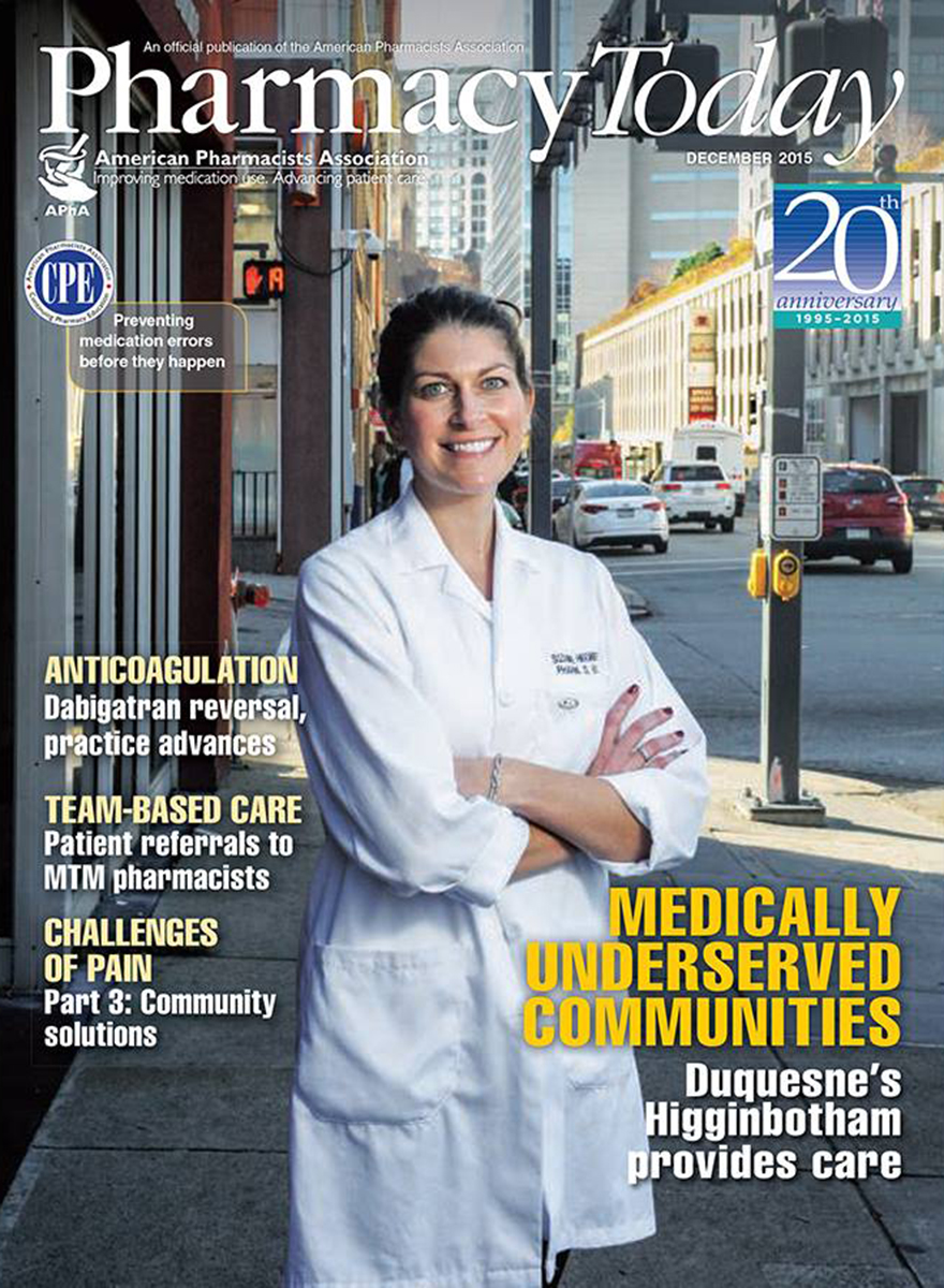 The December 2015 edition of Pharmacy Today, a monthly magazine published by the American Pharmacists Association, featured Suzanne Higginbotham, Pharm.D., the Director of the Duquesne University Pharmacy, on the cover and included a feature story on the ongoing efforts of the Duquesne University School of Pharmacy to serve the medically underserved.