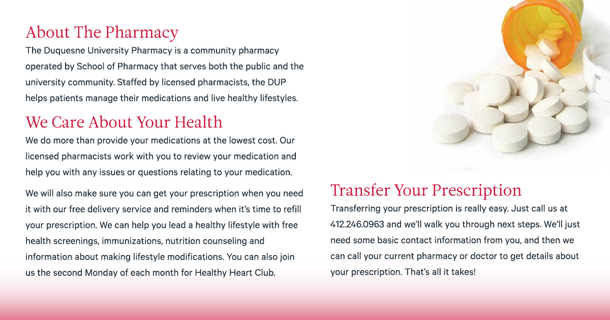 The Duquesne University School of Pharmacy opened the Duquesne University Pharmacy in 2010 in one of the most medically underserved areas of Pittsburgh only a few minutes from campus. In 2015, I worked with the Director of the Duquesne University Pharmacy to re-brand the the pharmacy from the Center for Pharmacy Services, promote a new delivery service to fill prescriptions for students, faculty, and staff on campus, and build brand awareness in the community..
