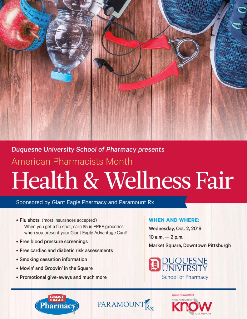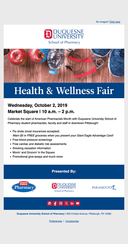 In 2019, the Duquesne University School of Pharmacy received a $20,000 grant from Paramount Rx and Giant Eagle Pharmacy to promote the annual Health and Wellness Fair in Market Square. At the annual event, student pharmacists set up 20 to 25 booths in the heart of downtown Pittsburgh and offer flu shots and free health screenings and health information to the public. The Associate Dean for Student Services asked me to use the grant funding to develop and launch a multichannel marketing and communications campaign to increase awareness of the event to boost community engagement at the event.
