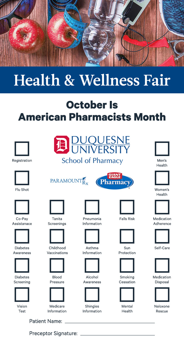 To track engagement, School of Pharmacy staff members members at the registration booth gave members of the public a “passport” to collect “stamps” from different booths after completing the activity or interacting with the student pharmacists. After receiving all the “stamps,” participants returned completed the “passports” to the registration booth to be entered in a raffle for a Giant Eagle Market District gift basket.