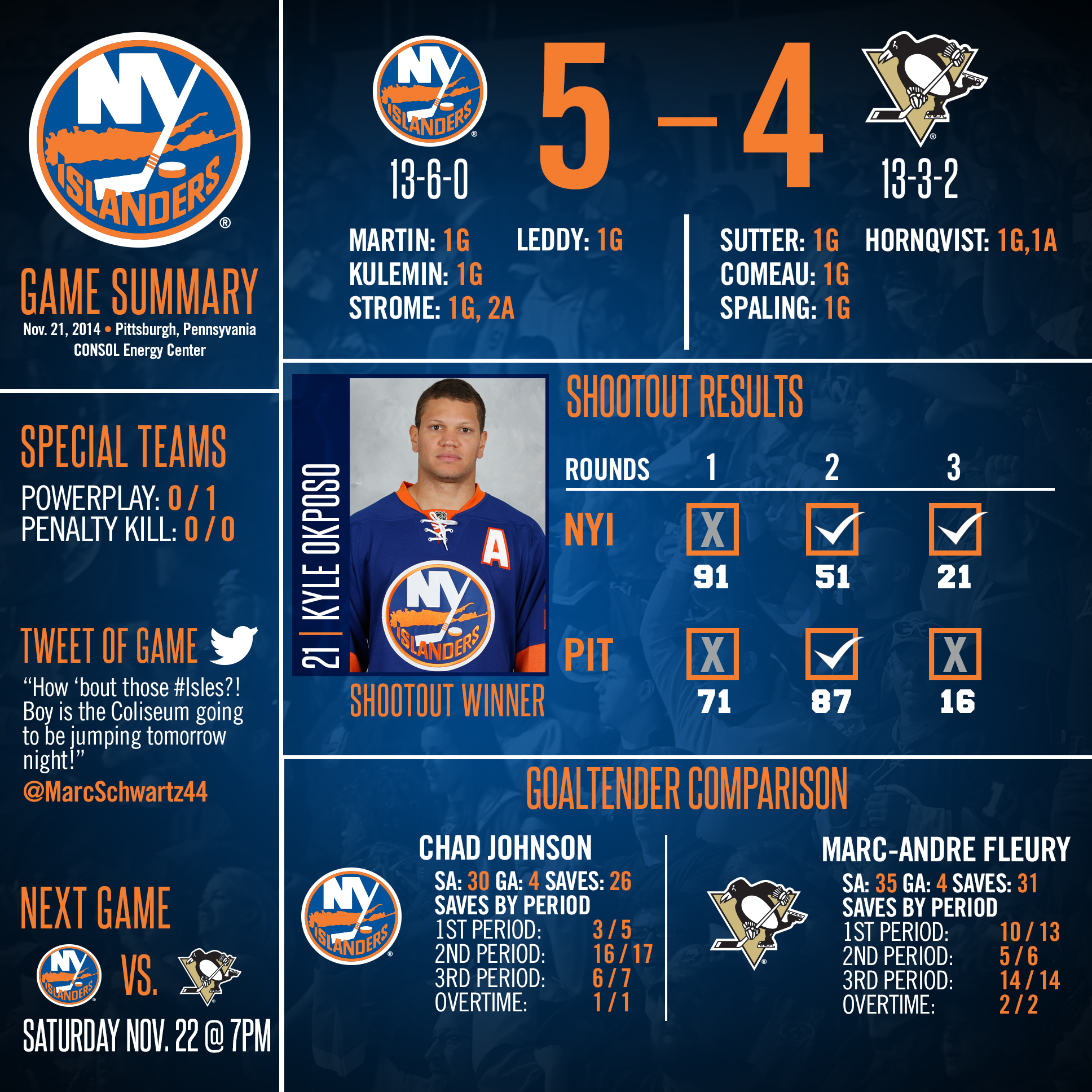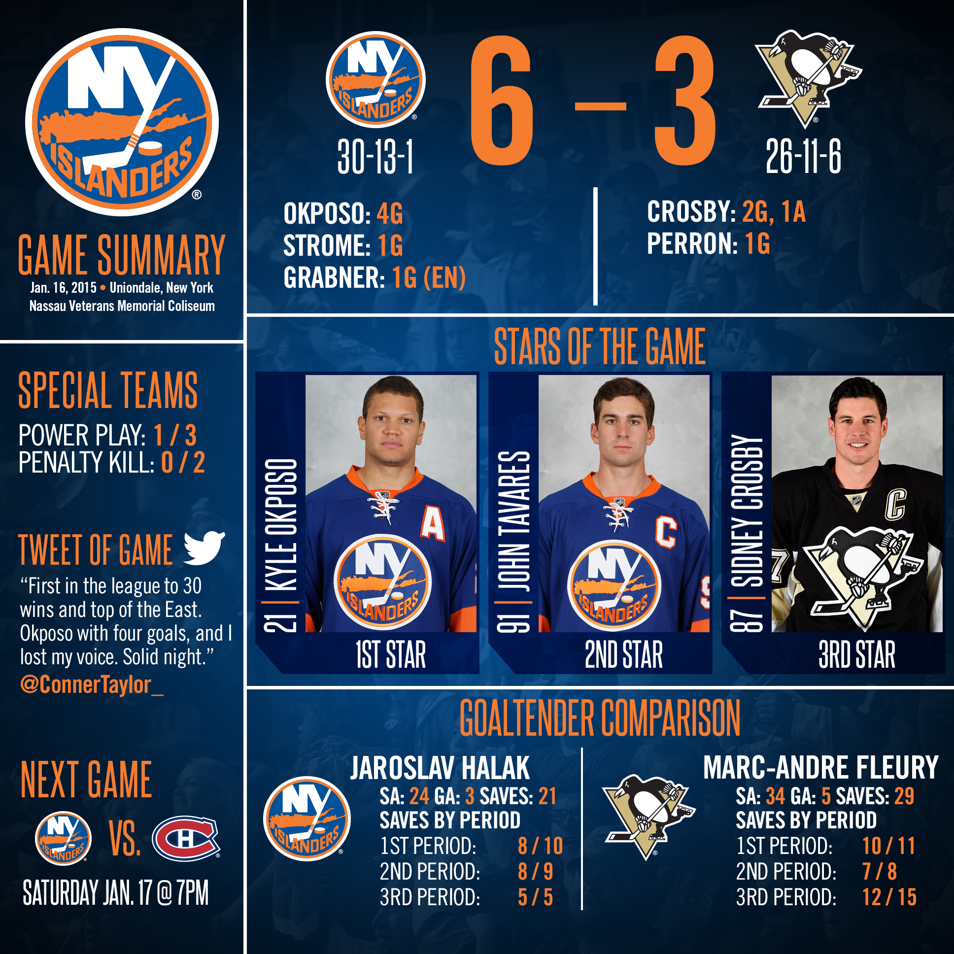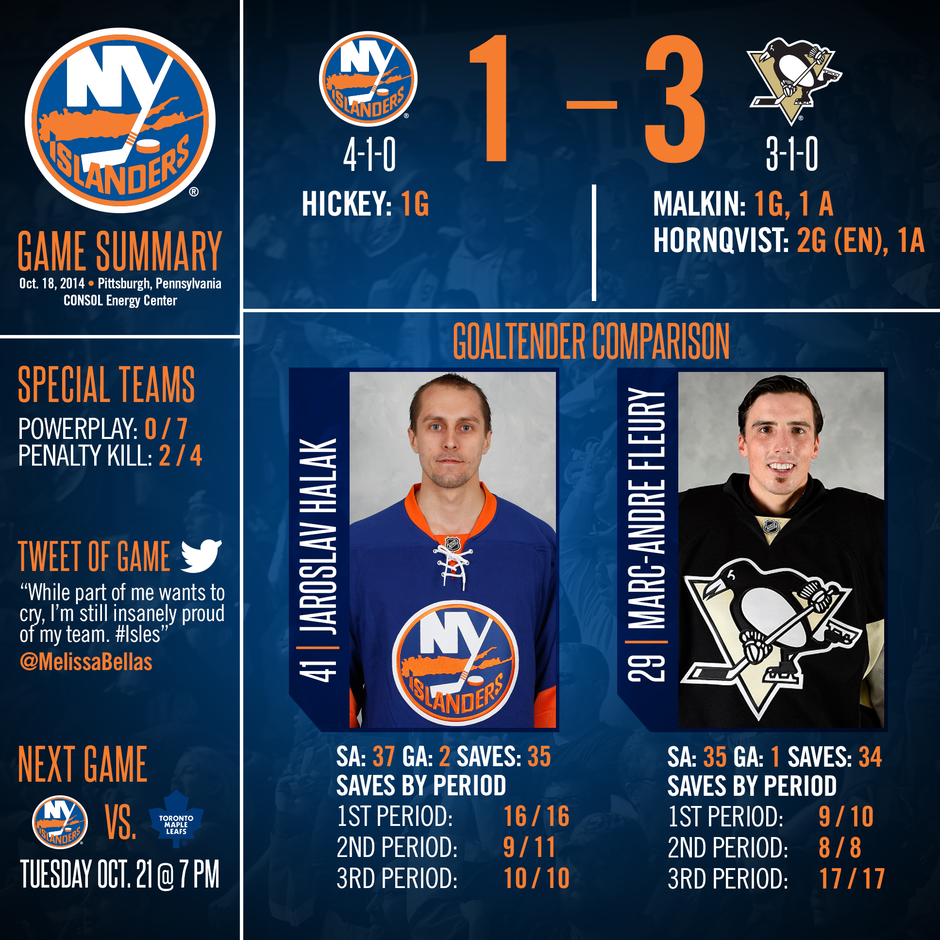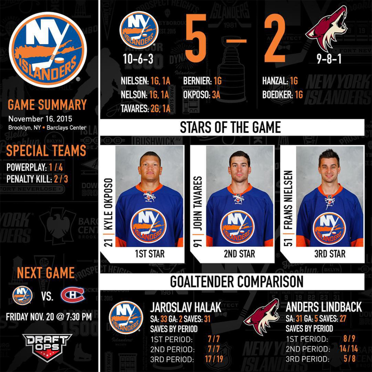 As the public relations graduate assistant with the New York Islanders marketing and communications team for the 2014-15 NHL season, I conceptualized the idea for a digital game recap to share on social media. I worked with the social media coordinator on the layout and the graphic designer on the design. I presented the idea to marketing and communications leadership and took on the responsibility of updating the graphic after games.
