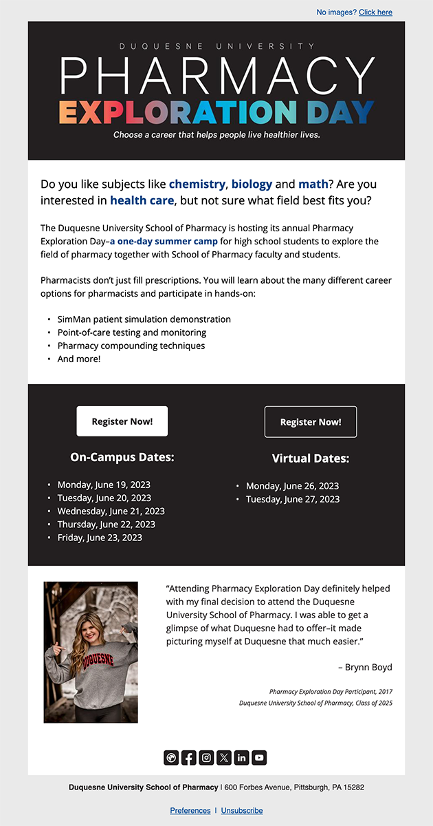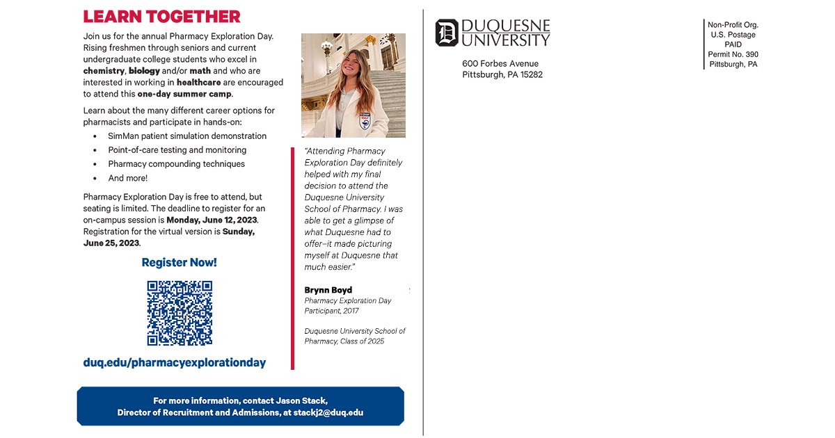 The Dean of the Duquesne University School of Pharmacy and the Director of Recruitment and Admissions wanted to develop a cohesive multichannel marketing and communications strategy to generate demand for the 2023 version of the annual Pharmacy Exploration Day, a one-day camp immersing high school students interested in pharmacy and the health sciences into a day-in-the-life of a student pharmacist on the Duquesne University campus.