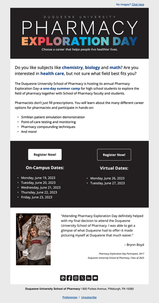 With a budget of $10,000 for a digital marketing campaign, I worked with the university marketing and communications team to create a paid media campaign using Peachjar, a niche email marketing platform partnered with local school districts, a pay-per-click campaign on Google and Meta. Additionally, I used organic social media to increase reach, highlighting past participants turned current student pharmacists and produced a video from footage captured at the last Pharmacy Exploration Day. Finally, I used a customer relationship management platform to prospective students.